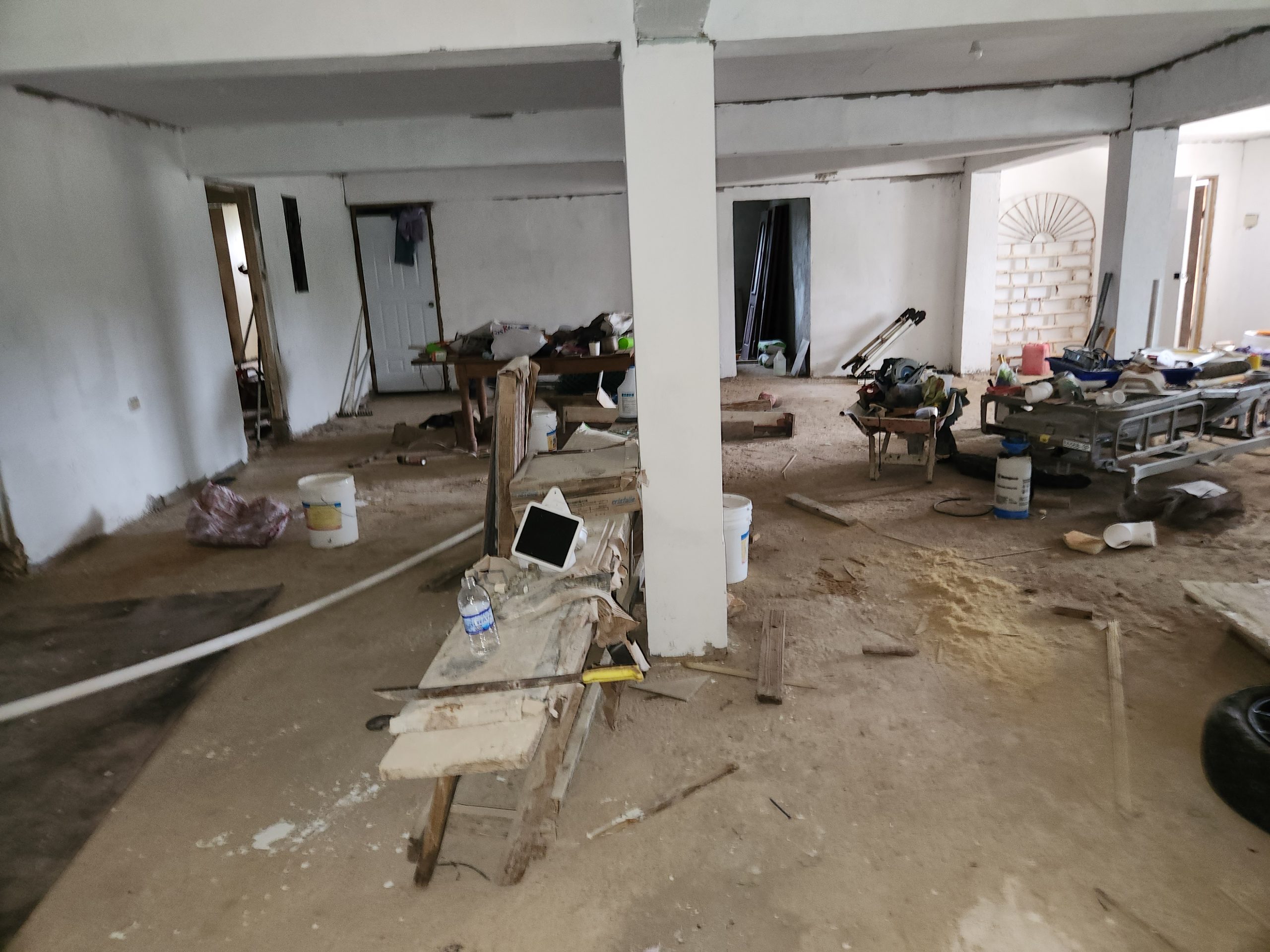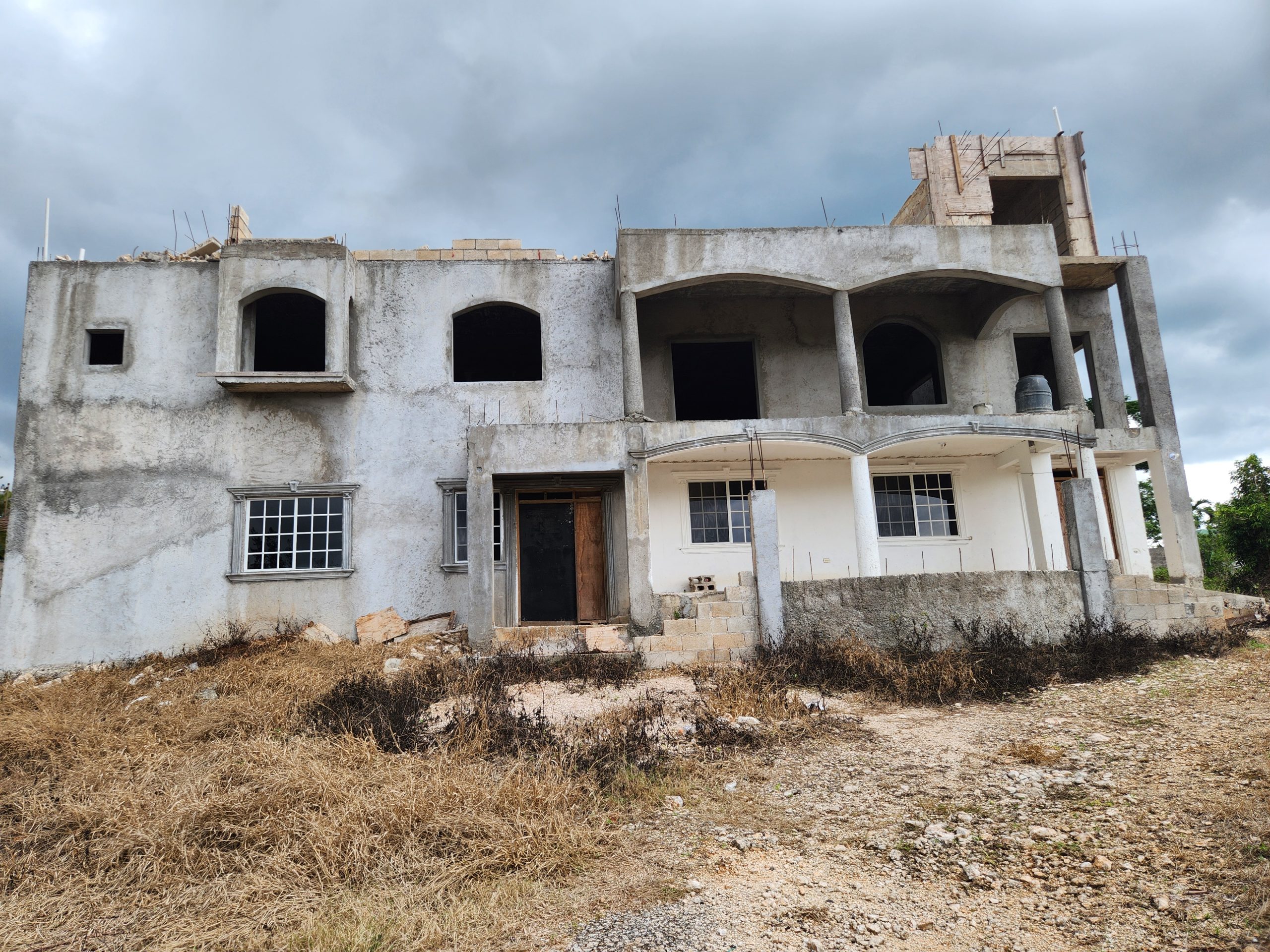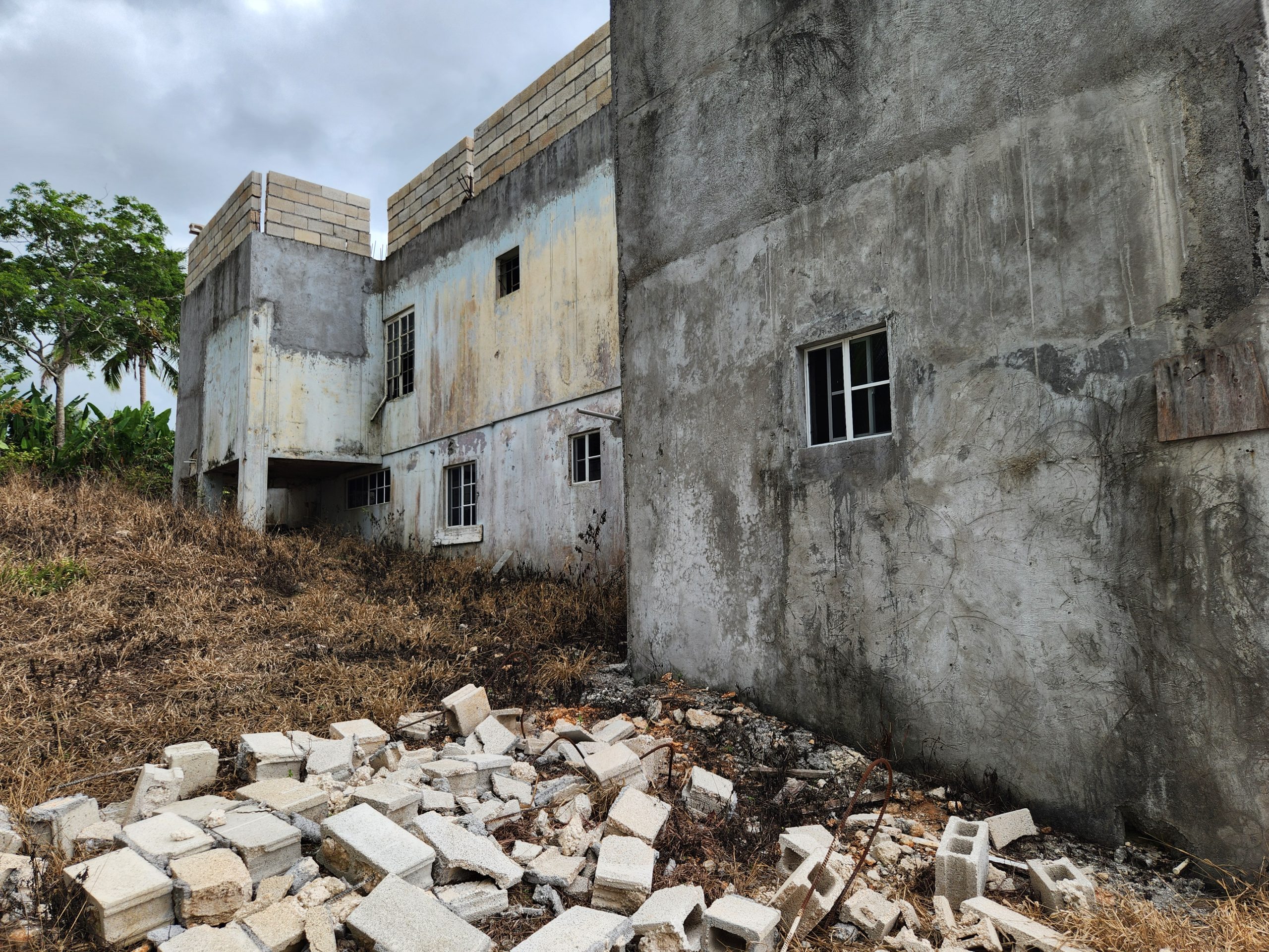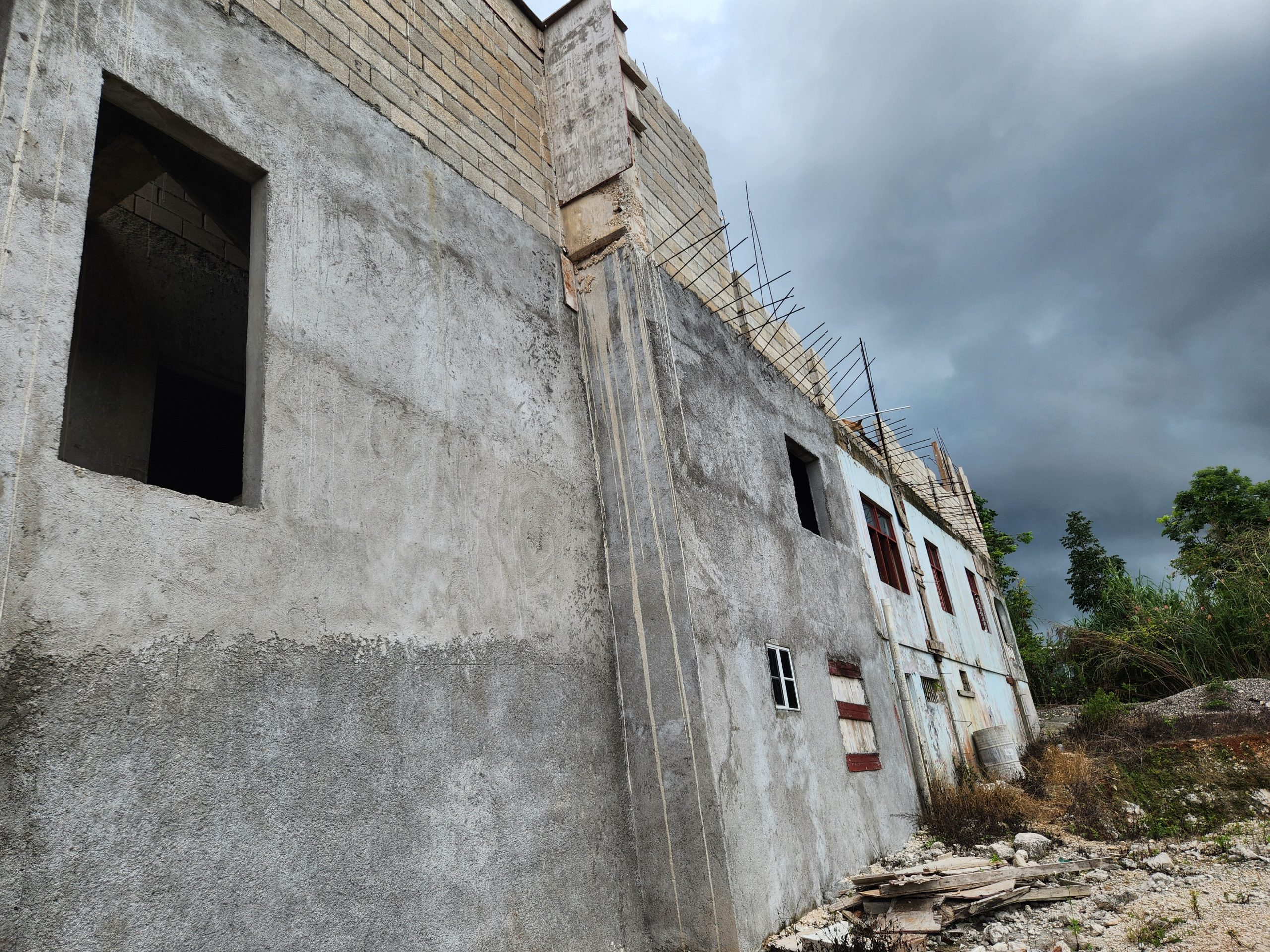Ground Floor : Stepped level patio, living/dining room, kitchen, prayer room, utility areas, three bedrooms, three bathrooms and stairway. First Floor : Front balcony, living/dining room, kitchen, four bedrooms and three bathrooms. Upper floor: 10% complete with walling of two eight block heights except for fully enclosed and covered stairway. |